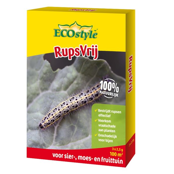 Bestrijdt rupsen 100% natuurlijk. Voorkomt bladschade door rupsen. RupsVrij is een biologische spuitvloeistof, met micro-organismen als natuurlijke werkzame stof. De rupsen, waaronder ook van de buxusmot, eten de bladeren met het opgespoten mengsel op. De vraat stopt binnen enkele uren en binnen een paar dagen sterven de rupsen. Onschadelijk voor bijen.